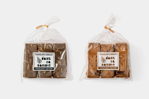 トラベラーズビスケットはdans la natureの千葉奈津絵さんが、トラベラーズノートをイメージして作ってくれたオリジナルのビスケットです。中目黒のオープン当初は定番として扱っていましたが、昨年に続き今年も期間限定で復活します!トラベラーズノートの色にあわせた黒は、どこかなつかしい、異国のおやつをイメージしたココアのビスケット。茶は、ザクザクっとした噛みごたえがあるほんのりキャラメル風味の香ばしいナッツ入りです。