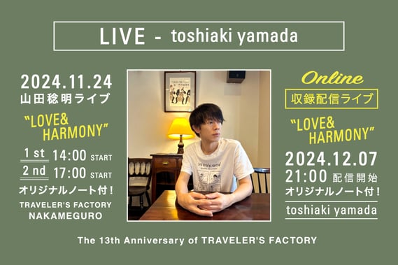 GOMES THE HITMANとしても活躍する山田稔明さんのライブ。今年のテーマは"LOVE & HARMONY"です。有観客ライブとオンライン配信のW開催!もちろんトラベラーズファクトリーでのライブの定番、山田さんとのコラボレーションによるオリジナルノートリフィルのプレゼントもあります。
