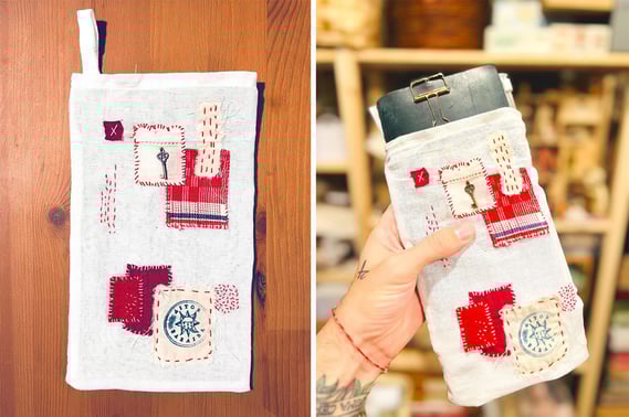 コットンバッグ カスタマイズ ワークショップでは、トラベラーズノート レギュラーサイズにちょうどぴったりのサイズのコットンバッグ(トラベラーズノートのパッケージに付属しているコットンより少し厚めのコットン生地になります)に、写真のようなパッチワークや刺繍をほどこしてカスタマイズすることができます。