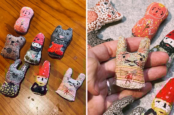 Aitor Saraiba(アイトール・サライバ)展 の展示作品の一部をご紹介します。手のひらサイズの人形のようなオブジェです。刺繍で表現された独特の色彩と訴えかけるような表情に思わず見入ってしまいます。(こちらの作品は販売予定です)