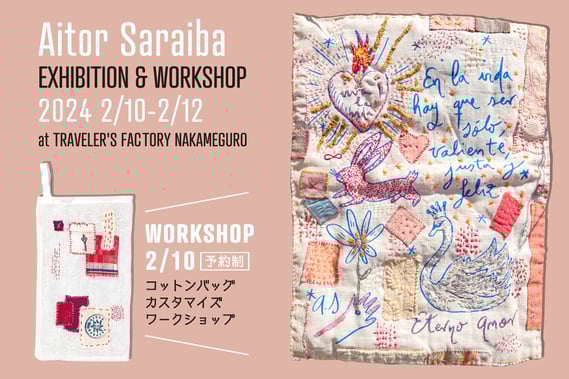 また、2月10 日(土)にはアイトールさんによるコットンバッグ カスタマイズ ワークショップを開催します。アイトールさんのアドバイスのもと、トラベラーズノート用のコットンバッグに刺繍やパッチワークを施すことで、アート作品のようなオリジナルのコットンバッグを作ることができるワークショップです。生粋のトラベラーズノートユーザーであり、自由な発想で斬新な作品を制作するアーティストであり、とても楽しく気さくなアイトールさんとお話をしながら、ものづくりを体験できる絶好の機会です。ぜひご参加ください。