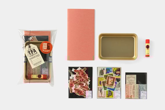 ノートのカスタマイズやコラージュにぴったりのヴィンテージ紙ものセット3種類、固形アラビックのり5g、コラージュをする際に素材を並べておくのに便利なアルミバットに、コラージュ用のノートとしてもおすすめのトラベラーズノート リフィル クラフト ピンクをセットしました。風合いがある紙に昔ながらの印刷方法が施されたヴィンテージの紙ものを使ってのコラージュがすぐに楽しめるセットです。