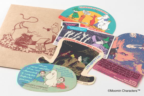 『たのしいムーミン一家』のさまざまなシーンを再現したステッカーは5種類、封筒にセットしました。