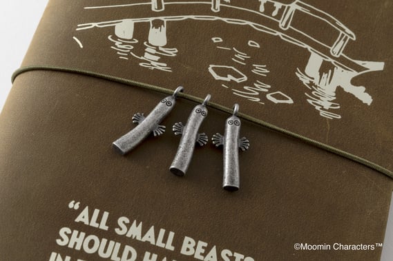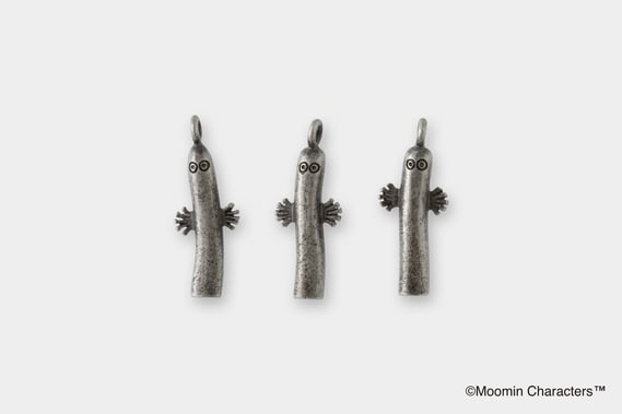 チャームは、ニョロニョロをモチーフにデザインしました。小説では、冒険号に乗って海へ漕ぎだしたムーミンたちは、はなれ小島に上陸。そこでたくさんのニョロニョロに出会います。ニョロニョロは集団で行動する特徴があります。なので、微妙に形が違う三体のニョロニョロを一緒にトラベラーズノートに付けてください。