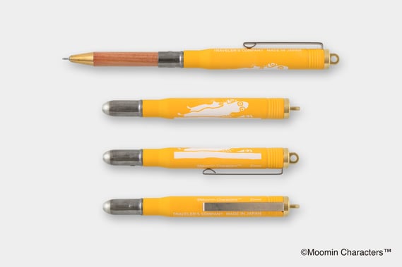 ブラスボールペンも、ニョロニョロをモチーフにデザイン。雷の電気を蓄えるニョロニョロをイメージしたイエローのボディに、木陰から覗くニョロニョロをプリント。さらに、小説の中のシーンを挿絵とともに再現した、5種類のステッカーを加えて、本をイメージしたボックスにセット。手にすることで、『たのしいムーミン一家』の物語の世界を感じられるトラベラーズノートとカスタマイズアイテムになっています。