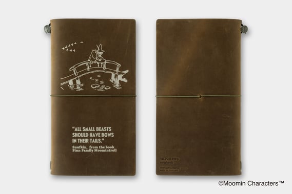 トラベラーズノート オリーブの革カバーには、ムーミンとスナフキンがムーミンやしきの近くの川にかかる橋の手すりに並んで座る挿絵と、スナフキンがそこで歌っていた詩を箔押しで表現。冬眠から目覚めて、ふたりで春の訪れを存分に楽しんでいます。