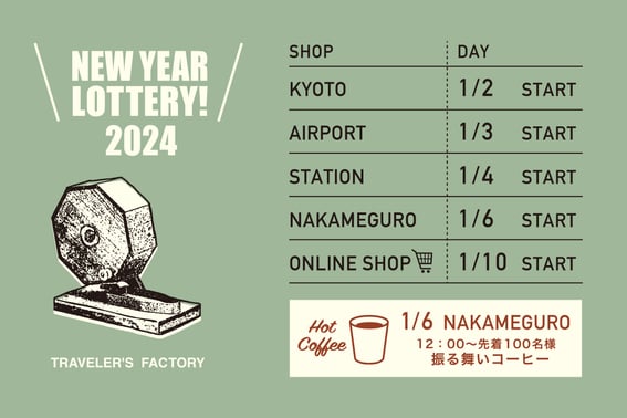 今回は、今年の2月に再オープンしたエアポートを新たに加え、中目黒・エアポート・ステーション・京都の4店舗で「新春福引」を実施。リフィル、ステッカー、カンバッジに、レザータグやコースターなどの豪華景品が、外れくじなしで当たります!さらに福引参加者の全員に、限定トラベラーズノートが当たるWチャンスにチャレンジできるNEW YEAR LOTTERY TICKETをプレゼントします。また2024年のカスタマイズ初めとして、各店の新春営業開始日から1月15日まで新春限定 New Year Stampを設置します。また、中目黒では「新春福引」のスタート日、1月6日に振る舞いコーヒーを実施します。
