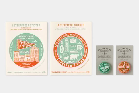 新春イベント恒例の New Year ステッカーとカンバッジもご用意しています。ステッカーは、トラベラーズタウンをテーマにデザインし、流山工場の活版印刷機で製作しました。2024年への新しい旅立ちを共に過ごすトラベラーズノートに!