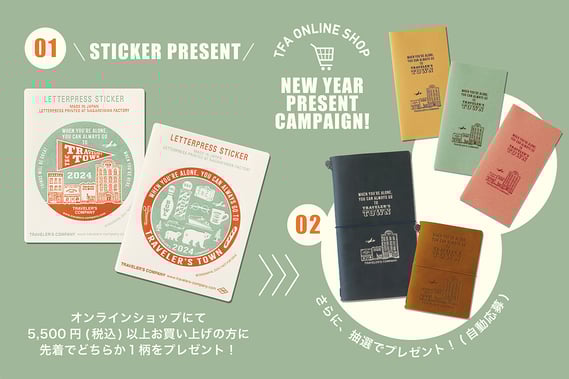 1月10日(水)よりトラベラーズファクトリーオンラインショップにて5,500円(税込)以上お買い上げの方に、2024年のテーマ、トラベラーズタウンをデザインし、活版印刷で作ったオリジナルステッカーをプレゼントします!さらに自動的に抽選枠に参加となり、当選者の方には新春限定トラベラーズノートまたはリフィルをプレゼントします。2024年をともに過ごしたいリフィルやチャームなどを手に入れて、チャレンジしてみてください!