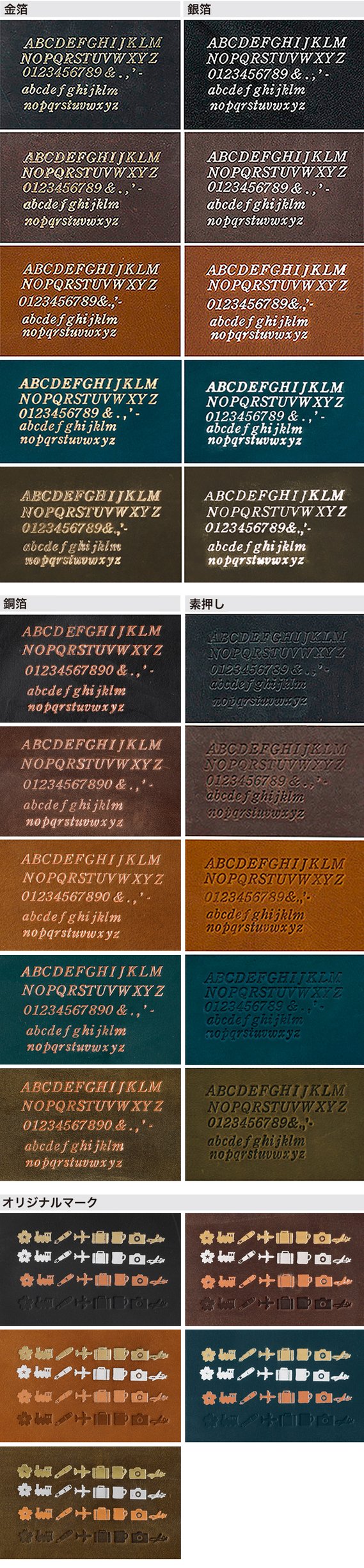 オリジナルマークは、新登場の桜に、トレイン・万年筆・飛行機上・トランク・マグ・カメラ・飛行機横の8種類、また箔色は、金・銀・銅・素押しの4種類より選べます。