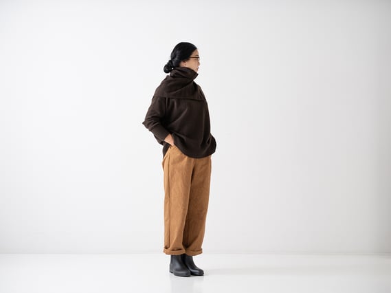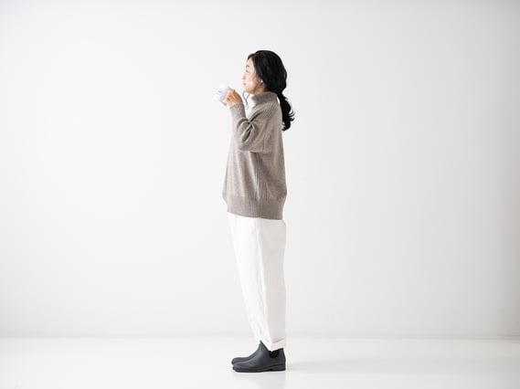 家で編み物をすることが多いまみさんが、たくさん着込んで編んでいたら肩が凝ってしまう悩みを抱えていた中で、寒い冬でも、Tシャツみたいに気軽に着れる日常使いのセーターが欲しいと思ったのがCA&Co. が生まれるきっかけでした。そこでたどり着いたのが、軽くて肌触りがやさしく、あたたかなカシミアやヤクのニットだったそうです。CA&Co. のニットは、まみさんが自ら着続けながら、ほんとうに自分が着たいものをデザインし、希少で上質な素材を使って小ロットで作っています。CA&Co. のカシミヤやヤクのニットは、あたたかく着心地がいいのとあわせて、毛玉ができにくく、洗濯などのお手入れも簡単で長く着続けられるのも特徴です。