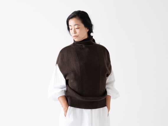こちらはヤクのベスト。真冬はもちろん、秋や春先のセーターを着るには少し暑いけど、ワンピースやシャツ1枚では肌寒いという日に重ね着するのにもとても便利です。身幅はゆったりオーバーサイズですが、中心のゴム編みの効果で大きく見えないのもポイント。肩はドロップショルダーですので、肩を強調せず柔らかな印象です。オーバーサイズのTシャツなどに合わせても、脇の辺りがゴロゴロしません。