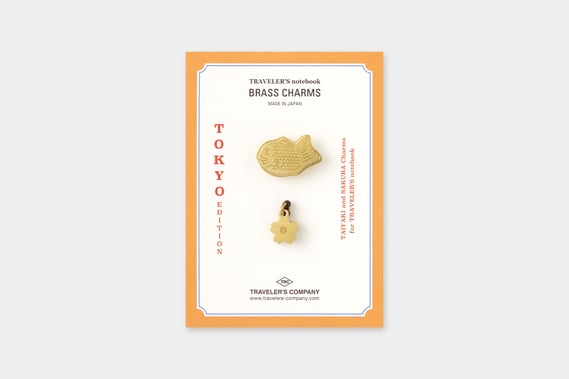 東京のおやつの定番たい焼きと、春になると東京の各地で咲き誇る桜をモチーフにしたブラスチャームです。たい焼きのチャームは、トラベラーズノートのゴムに取り付けるとスライドするように動かすことができます。桜のチャームはしおりの紐やゴムに付けてお使いください。