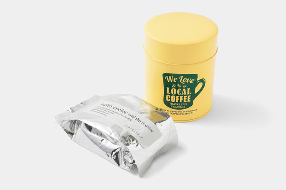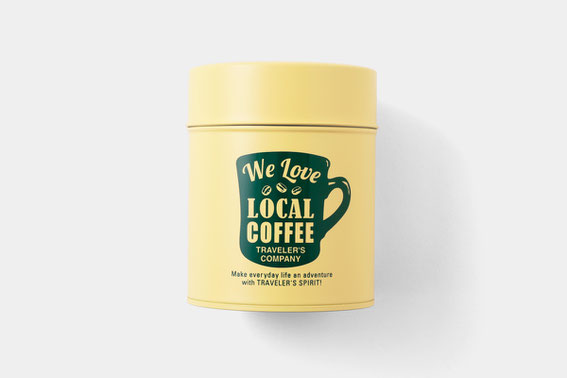 コーヒー缶は、トラベラーズスピリットのメッセージの中から、「We Love Local Coffee」をピックアップしてデザインしました。まさにコーヒー缶にぴったりのデザインになっています。