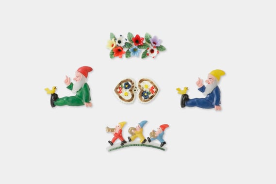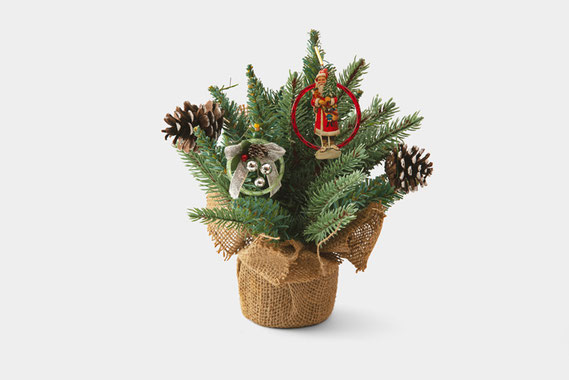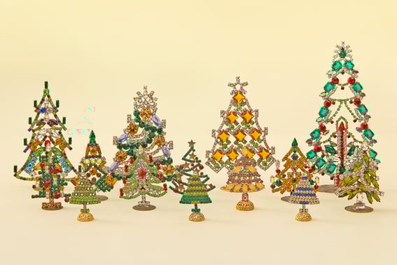 きらきらとやさしく瞬くラインストーンが並ぶ手のひらサイズのクリスマスツリーは、チェコの小さな工房でひとつひとつ手作業で作られています。ガラスのラインストーンの繊細でやさしい輝きに手作りならではの素朴な佇まいが、心をじんわり温めてくれます。あわせて、同じチェコの工房で作られたブローチも並びます。ヴィンテージのチェコガラスや、プラスチックのどこかユーモラスな小人などをあしらったブローチです。さらにぐるぐると糸を巻きつけて作ったチェコの糸ボタンをヴィンテージのピンと合わせたブローチ、チェコのヴィンテージの香水瓶や指輪などもご用意いただきました。