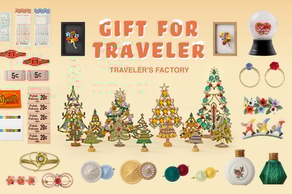 トラベラーズファクトリー中目黒、エアポート、ステーション、京都では、11月12日よりクリスマスギフトにおすすめのアイテムとして、大阪の雑貨店「チャルカ」から届いたチェコのラインストーンのツリーやブローチ、100年以上の歴史を持つPERZYのスノードーム、ヴィンテージのチケットやラベルをセットした紙ものセットなどを展開します。