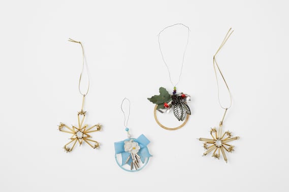 ヴィンテージのガラス製のリングに、リボンやオーナメントをあしらっています。クリスマスツリーのオーナメントにしたり、壁や机に飾ってみてください。