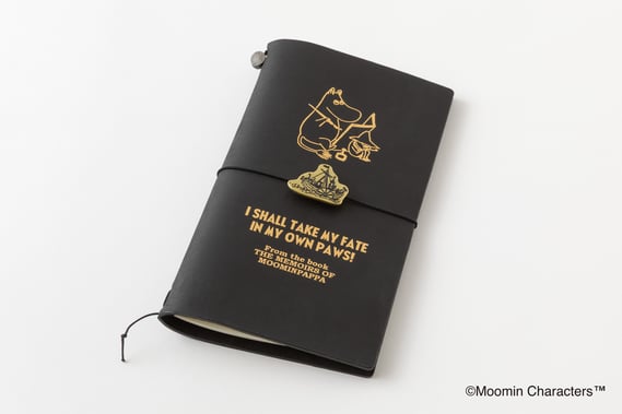 トラベラーズノート 黒の革カバーには、幼いムーミンパパが、みなしごホームを飛び出す決意を固めるシーンのセリフをセレクト。小説はムーミンパパが執筆した回想録という形式をとっています。そのシーンを描いたムーミンパパの挿絵とともにゴールドの箔押しで仕上げました。