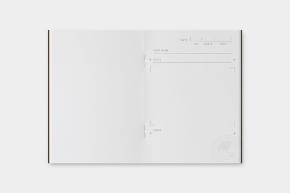 中の紙には、スタンプを押すスペースとあわせて、日付や店名が記入できます。無地ページには、その店で手に入れたショップカードやレシートを貼ったり、その町で訪れた場所や食べたものを描いたり、自由にお使いいただけます。また、スタンプを押しても裏抜けがしにくい厚めの紙を使用しています。