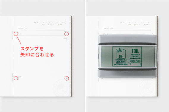 スタンプを中心に押しやすいようにガイドが印刷されています。スタンプの外枠を矢印に合わせてスタンプを押してください。