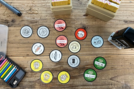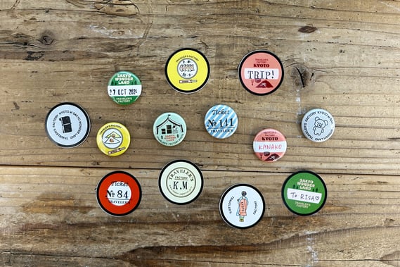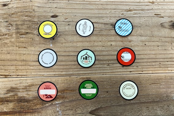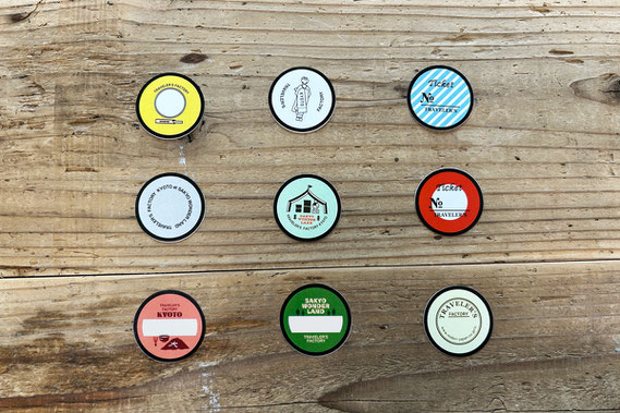 台紙ができたら、その場でカンバッジに加工してお渡しします。裏面はバッジタイプとチャームタイプの2種類よりお選びください。チャームタイプは、トラベラーズノートのゴムに付けることができます。