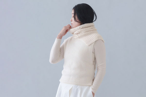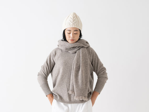 こちらは、カシミヤの糸を使って手編みで編み上げたネックウォーマーです。首の後ろの隙間もカバーしてくれるのでマフラーよりも暖かく、ふんわり柔らかな肌触りと軽さで、つけている事を忘れてしまうほど。お出かけにもお家時間でもいつでもつけたくなるネックウォーマーです。