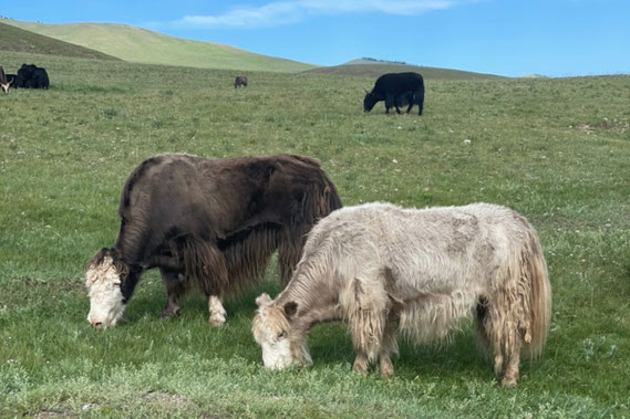 ヤクは、標高4000m以上の草原や岩場に生息する、寒さに強い希少なウシの仲間です。モンゴルでもカシミヤの生息地よりもより高地で暮らしています。寒冷地に生息しているため、厳しい寒さから身を守れるようやわらかい内側の毛と外側の硬い毛とで覆われ、保温性や防水性に優れ、毛は分厚くなっています。