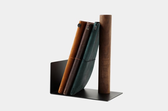 「本を魅せるスタンド」をコンセプトに作られたブックスタンド。鉄と木のシンプルな見た目で、文庫本から雑誌(A4サイズ)サイズの分厚い本、さらにトラベラーズノートもしっかり支えて収納できます。円柱の前に本の表紙を表に立てかけることでお気に入りの1冊をインテリアとしても飾ることができます。トラベラーズノートに似合うよう、もともと白だった鉄のパーツをブラックに塗装したオリジナルバージョンになっています。