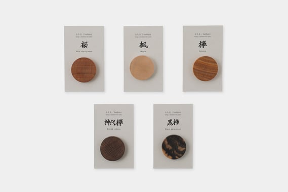 高密度で耐久性があり、古来より清水寺をはじめ神社仏閣の建築材として使われてきた欅(ケヤキ)、美しい木目とキメ細かい肌触りが特徴の楓(カエデ)、美しい花を咲かせることで木材からもほのかに香りが楽しめる桜、1000年以上土に埋まることで、地中の成分などの作用で変色した貴重な埋もれ木・神代欅(ジンダイケヤキ)、1万本に1本程度しかない木の中心部に墨のような黒色がある希少な柿の、独特のマーブル模様が美しい黒柿(クロガキ)をラインアップ。