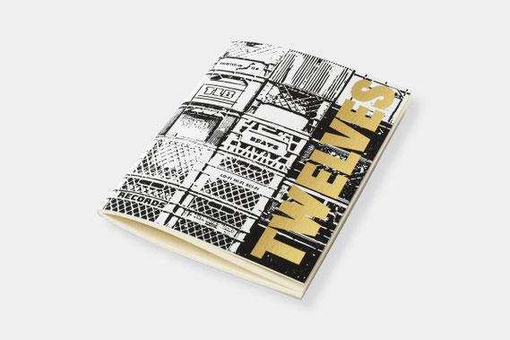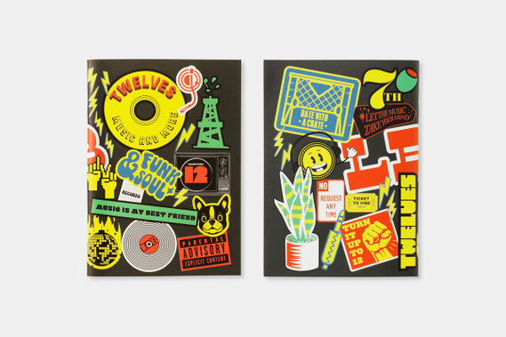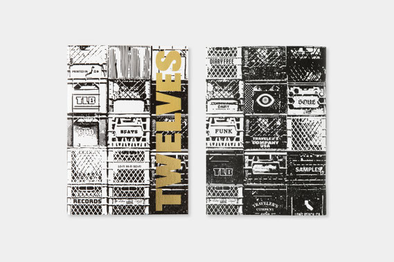表紙のデザインは、TWELVES RECORDのアートを担当しているトニー氏が制作。ミルククレート(もともとは牛乳を運ぶカートンケースですが、レコードショップでレコードを入れるボックスとしてよく使われています)が並んだモノクロのグラフィックにゴールドの箔押しでロゴを表現した「クレート柄」とTWELVES RECORDのアイコンがポップなイラストで散りばめられた「ステッカー柄」の2種類をラインアップしています。