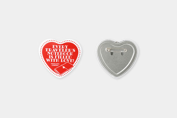 LOVE AND TRIPのメッセージ「Every TRAVELER'S notebook is filled with love」をデザインしたハート型のカンバッジです。バッグなどに留めれば、トラベラーズノートユーザーとの出会いが増えるかも。バレンタイン&ホワイトデーギフトに添えるのにもおすすめです。※オンラインショップではカンバッジの発売はありませんが、おすすめギフトセットにおまけとしてお付けいたします。