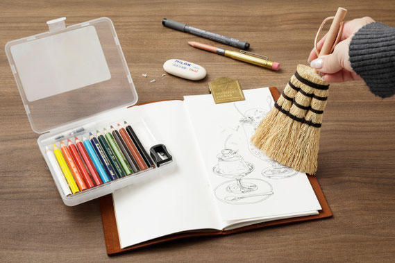 まずは、「ブラス ペンシル」にでラフに下書きをします。その上から「STAEDTLER ピグメントライナー」で輪郭を描きます。描き終わったら、「MILAN 消しゴム」で鉛筆の線を消しましょう。消しゴムのカスは、「デスクトップホウキ」できれいにします。その上から「uni 水彩色鉛筆 コンパクトセット 12色」を使うと、水彩のようなタッチの絵を描くことができます。