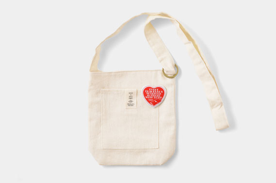 赤い巾着タイプのコットンバッグにLOVE AND TRIPのロゴとメッセージ「Let's draw a peace dove on TRAVELER'S notebook」をプリントしました。小物入れにはもちろん、バレンタイン&ホワイトデーギフトを入れるギフトバッグにもおすすめです。