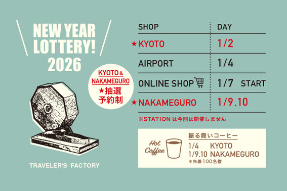 また、今年はトラベラーズファクトリー中目黒、京都の新春福引実施日の入店は、抽選予約になります。(ステーションでは福引の開催は行いません)。ご迷惑をおかけしますが、なにとぞご理解のほどよろしくおねがいします。