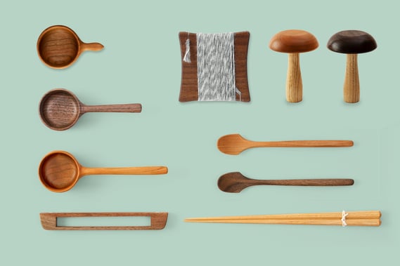 長野県木曽谷で無垢の木材を使い家具やカトラリーなどを作る二宮大輔さんによって営まれている工房。無垢の木材の木目や曲線を活かした美しいデザインと、機能性や使い勝手が両立した木工の道具を作っています。定番のコーヒースプーンに加え、ダーニングマッシュルームや糸巻、八角箸などが登場します。