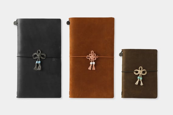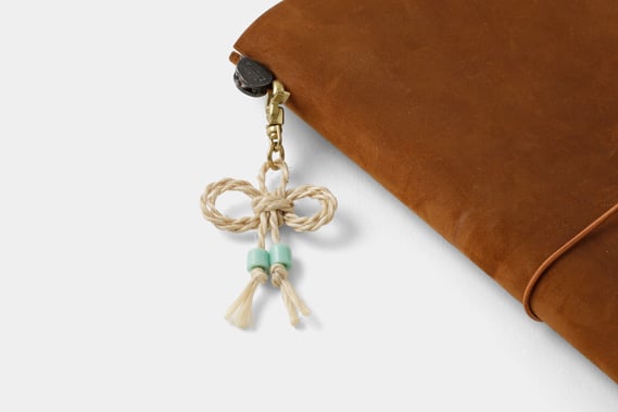 結び目の輪にゴムを通して、トラベラーズノートに留めることができます。ナチュラルとグレーのすす染は、二重叶結びになっています。結び目の表が「口」の字、結び目の裏が「十」の字になり、合わせると「叶」の文字になることから、叶(かのう)結びと呼ばれ、お守りの口を閉じるのによく使われます。ピンクのベンガラ染は、菊結びで仕上げられています。