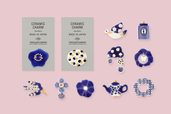 愛知県常滑の地で、日々の暮らしにそっと寄り添う陶器アクセサリーを制作する作家・阿部加奈さんによるブランド。トラベラーズノートのユーザーでもあり、TRCキャラバンのNAOT愛知で出会い、今回お声がけしました。青とゴールドの2色を使い陶器に絵付けしています。伝統的な絵付け顔料、呉須(ごす)が焼きあがることで生まれる深みのある青は、手仕事ならではの温かさがあります。