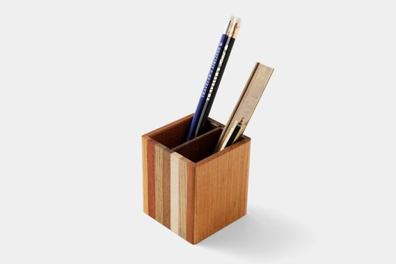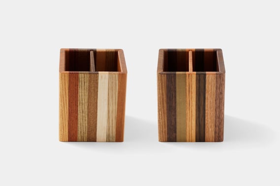 さまざまな木の質感や色目が縦に並ぶ寄木のペン立てです。いつものデスクに置けば、さりげない存在感を放ち、ノートに向かって何かを書く時間を楽しくしてくれます。10年後の経年変化した姿を想像しながら清水さんが樹の種類を決めてくれました。ぜひ、長く使っていただき、その変化をお楽しみください。